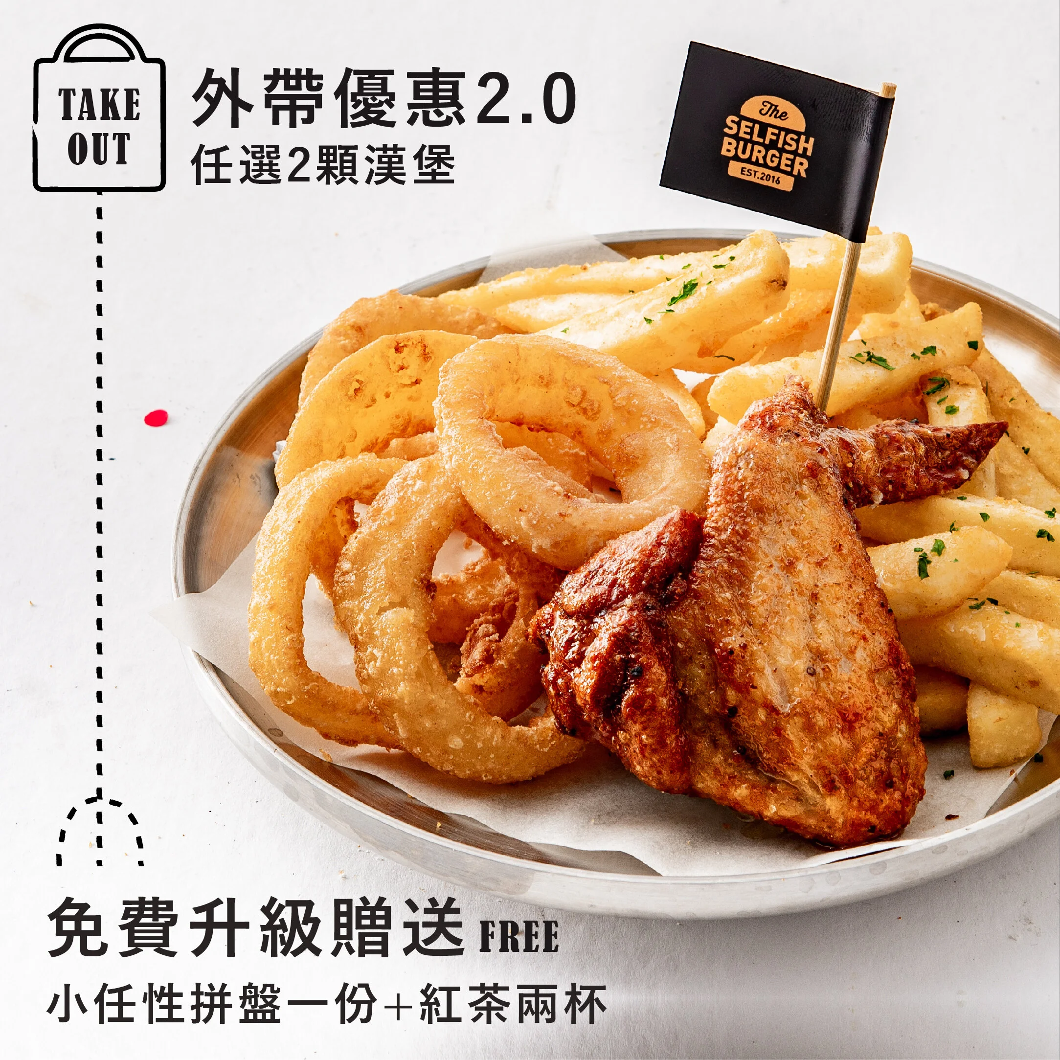 June 1, 2021 Guest User 外帶優惠2.0 拼盤送給你 June 1, 2021 Guest User 許多在疫情期間,還是很願意來到現場#用外帶,來支持我們的朋友 夥伴們都把這份感動放在心裡,老闆就跳出來說:#那就把這份感動,用行動來回饋給大家吧 所以!我們就做吧! 📍 即日起至8/1(日)門市外帶任兩顆漢堡📍 免費升級贈送小任性拼盤一份 + 紅茶兩杯📍 總價值高達280元~! #想吃就吃 #飽足感我叫老闆做給你#門市優惠恕不併用,敬請見諒線上點餐▼▼▼ 提前預訂 · 免等待 Guest User